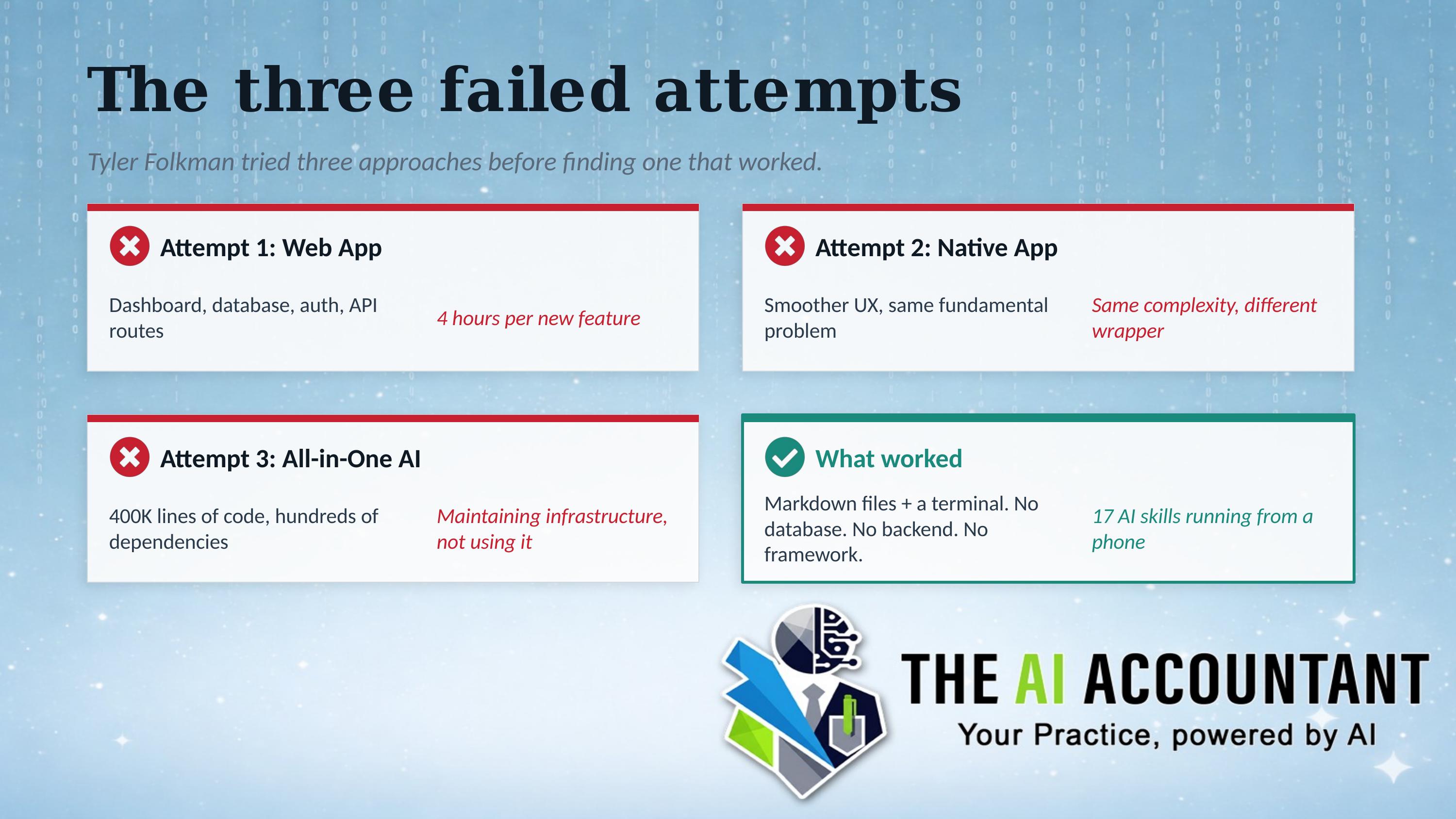 A software engineer tried three times to build an AI dashboard before realizing the answer was markdown files and structured knowledge. The same lesson applies to your CAS practice — the competitive moat isn't software, it's encoded practice knowledge that compounds.